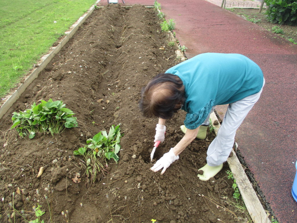 リハビリ農園でサツマイモの苗を植えています。