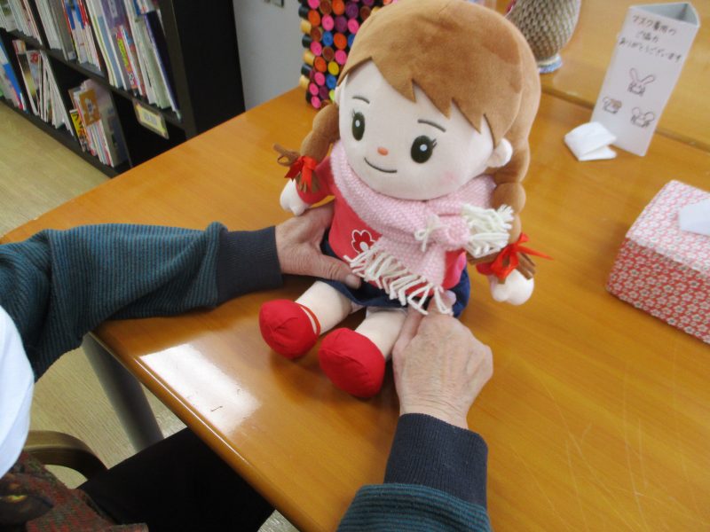 作業療法士のKです。 デイケアに新しい仲間が増えました!4歳の女の子人形“みぃちゃん”です。 このお人形は音声認識人形で、話しかけると答えてくれたり時間を教えてくれたりします。 みぃちゃんは早速みなさ …