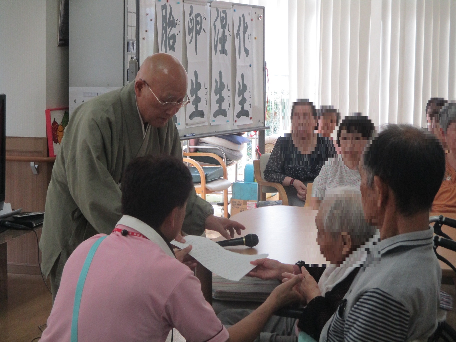 患者様からは、「楽しかった!」「お坊さん話が上手ね、面白かったわ」「勉強になった」「お寺巡りをして座禅を組んだことを思い出したわ」などの感想をいただきました。