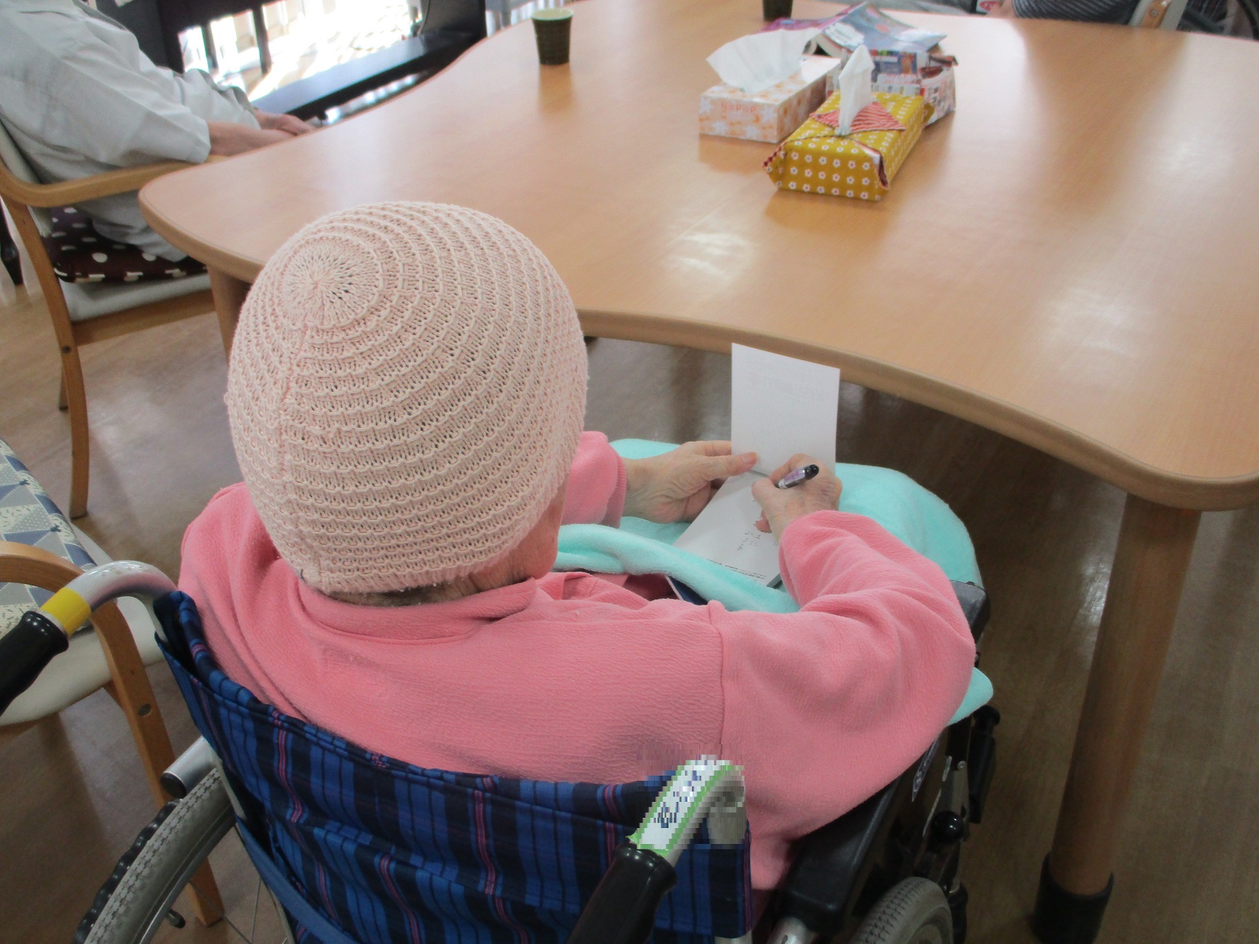 N様はデイケアで般若心経の写経を行っています。お坊さんに写経を納めて、笑顔でした。