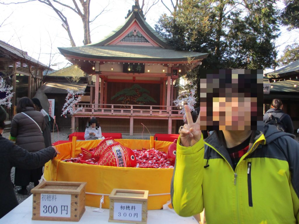 鯛のおみくじを背景に記念撮影です。素敵な笑顔をされています。(お見せできないのが残念です…)