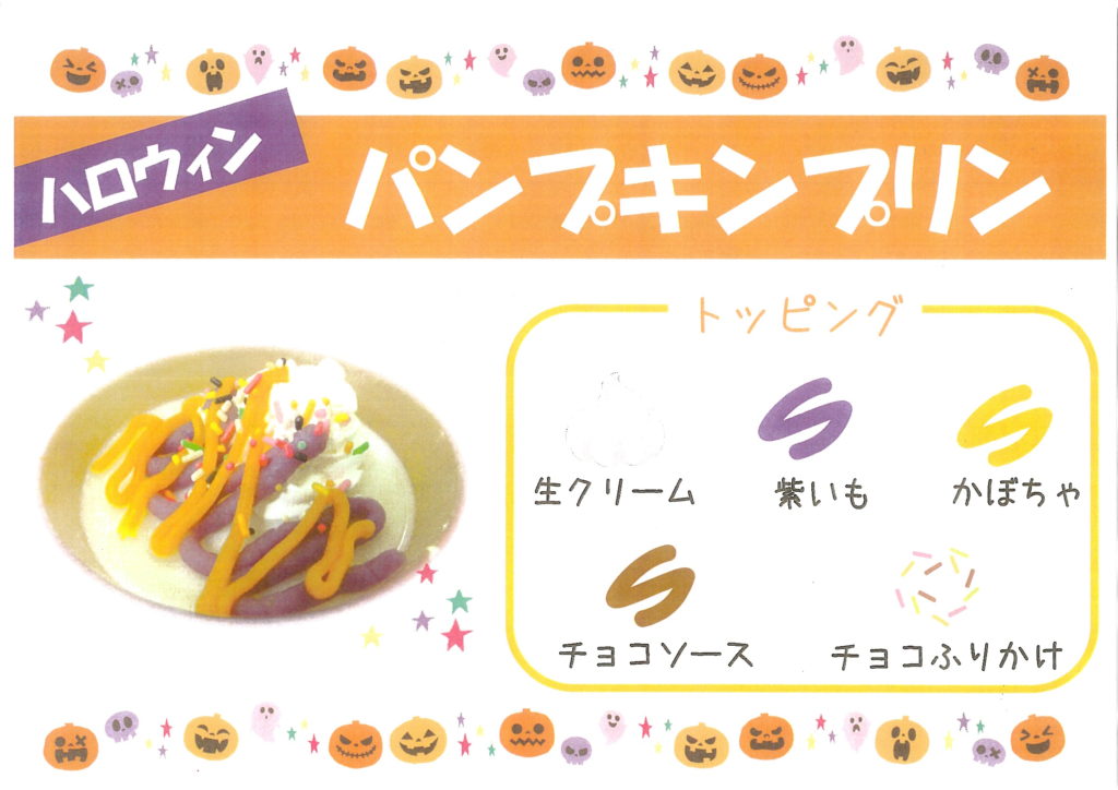 かぼちゃプリンに、生クリームや紫芋クリーム、カラフルなチョコなどを