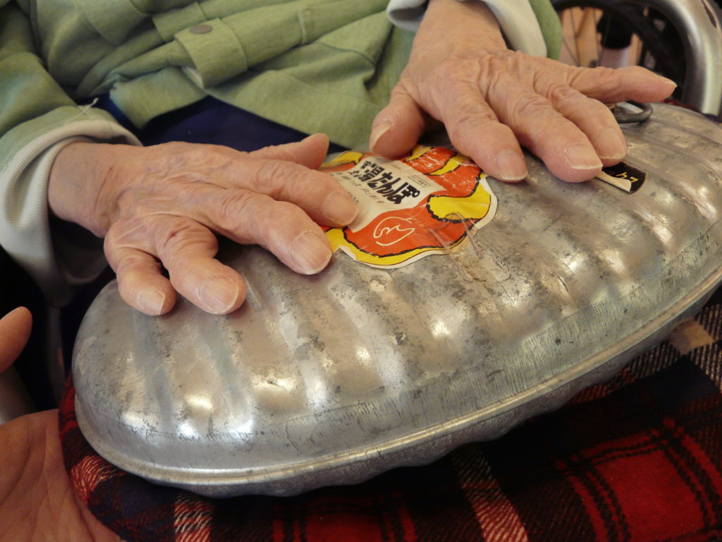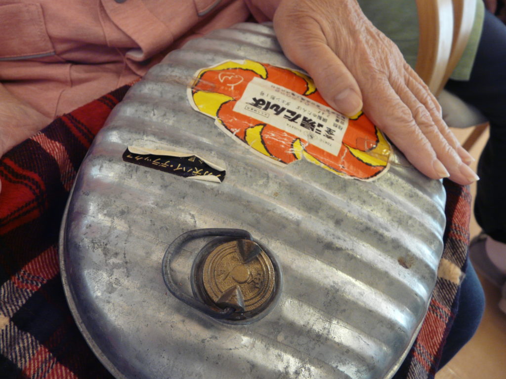 集まりでは、この年代物の「湯たんぽ」にお湯を入れ、